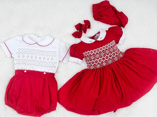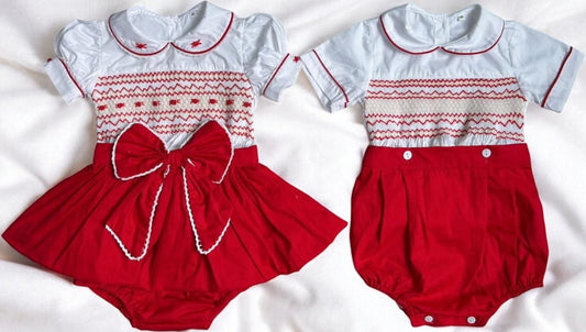 Red smocked boys suit ( got matching girls romper available )
