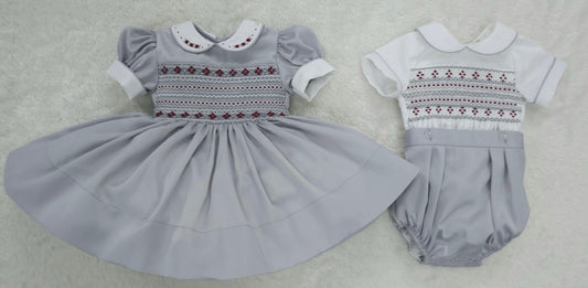 Silver satin smocked dress with Burgandy (got matching boys suit available )
