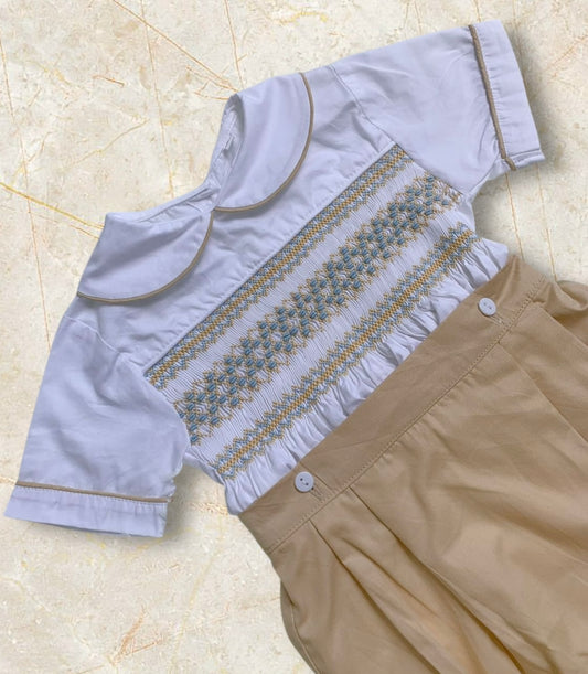 Tan with pastel blue smocking boys suit