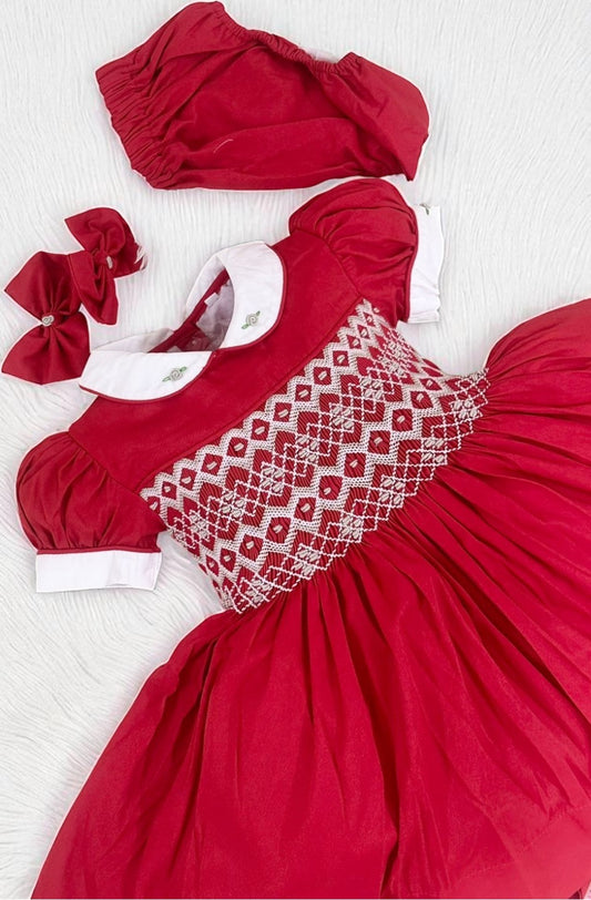 Red satin with gold smocking ( got matching boys suit available)
