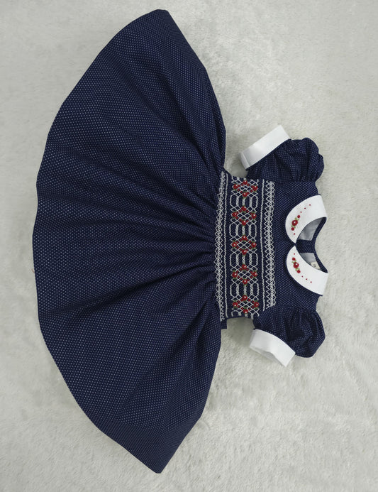 Navy polkadot with red and white smocking ( got matching boys suit available and matching girls romper )