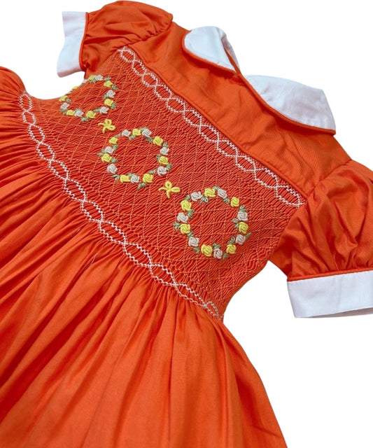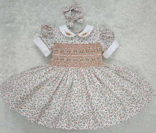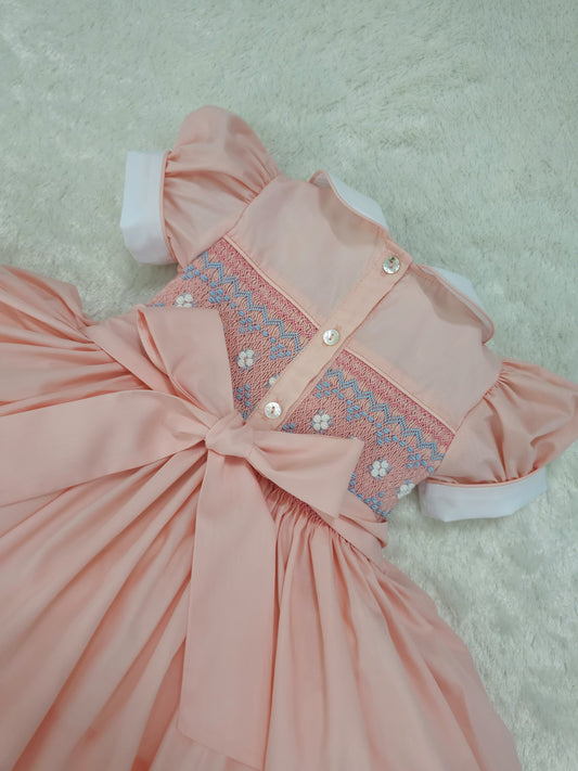 Peach Taffeta Hand-Smocked Dress with Lilac Embroidery