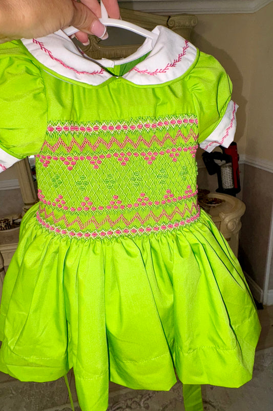 Pastel Lime Smocked Dress with Embroidered Chest & Collar