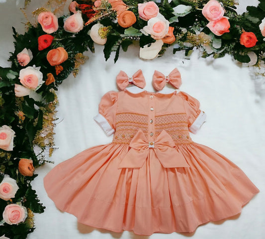 Floral smocked dress with peach embroidered flowers
