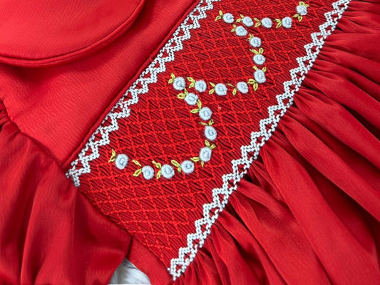 Red satin hand smocked pyjamas with garland