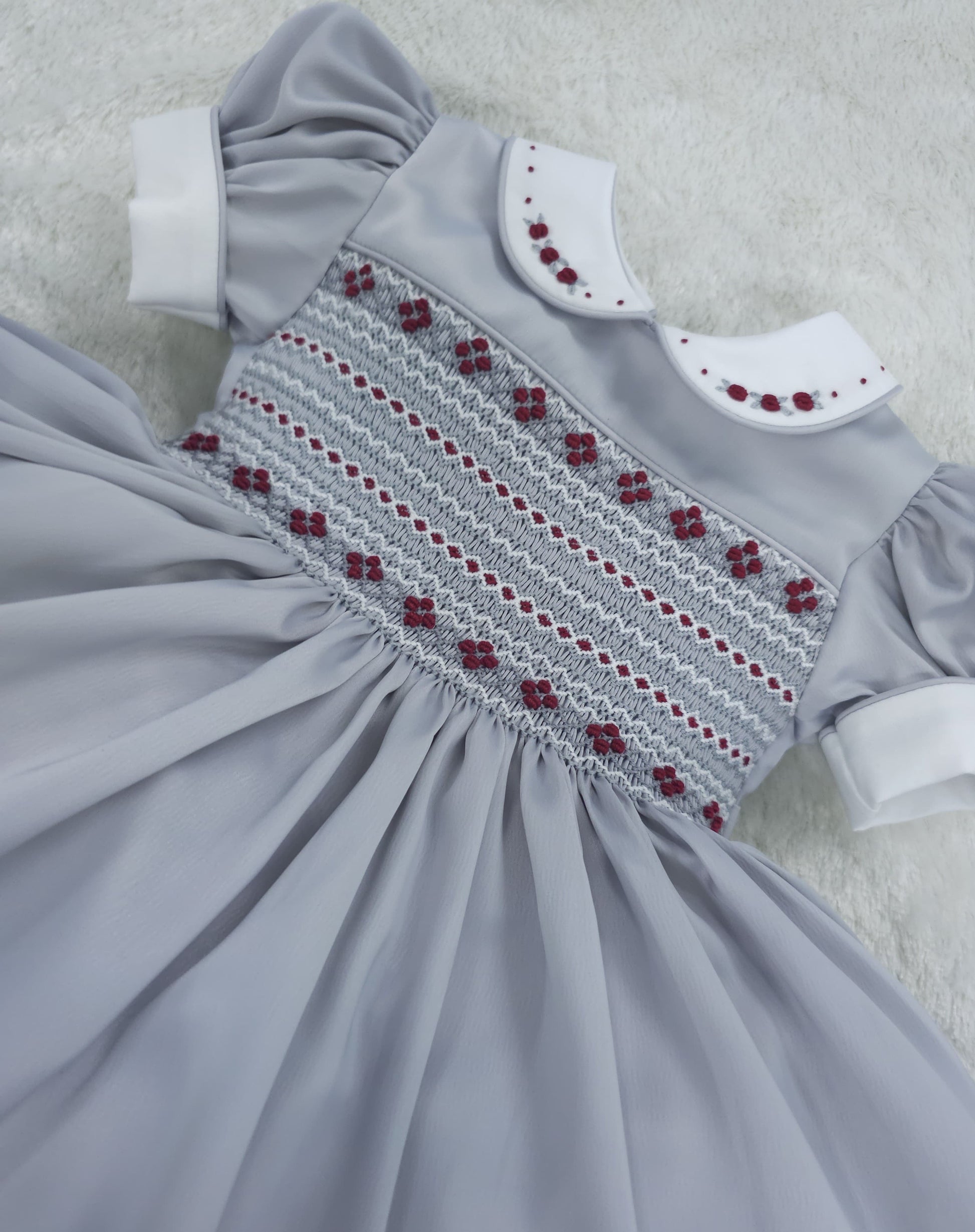 Silver satin with Burgandy (got matching boys suit available )